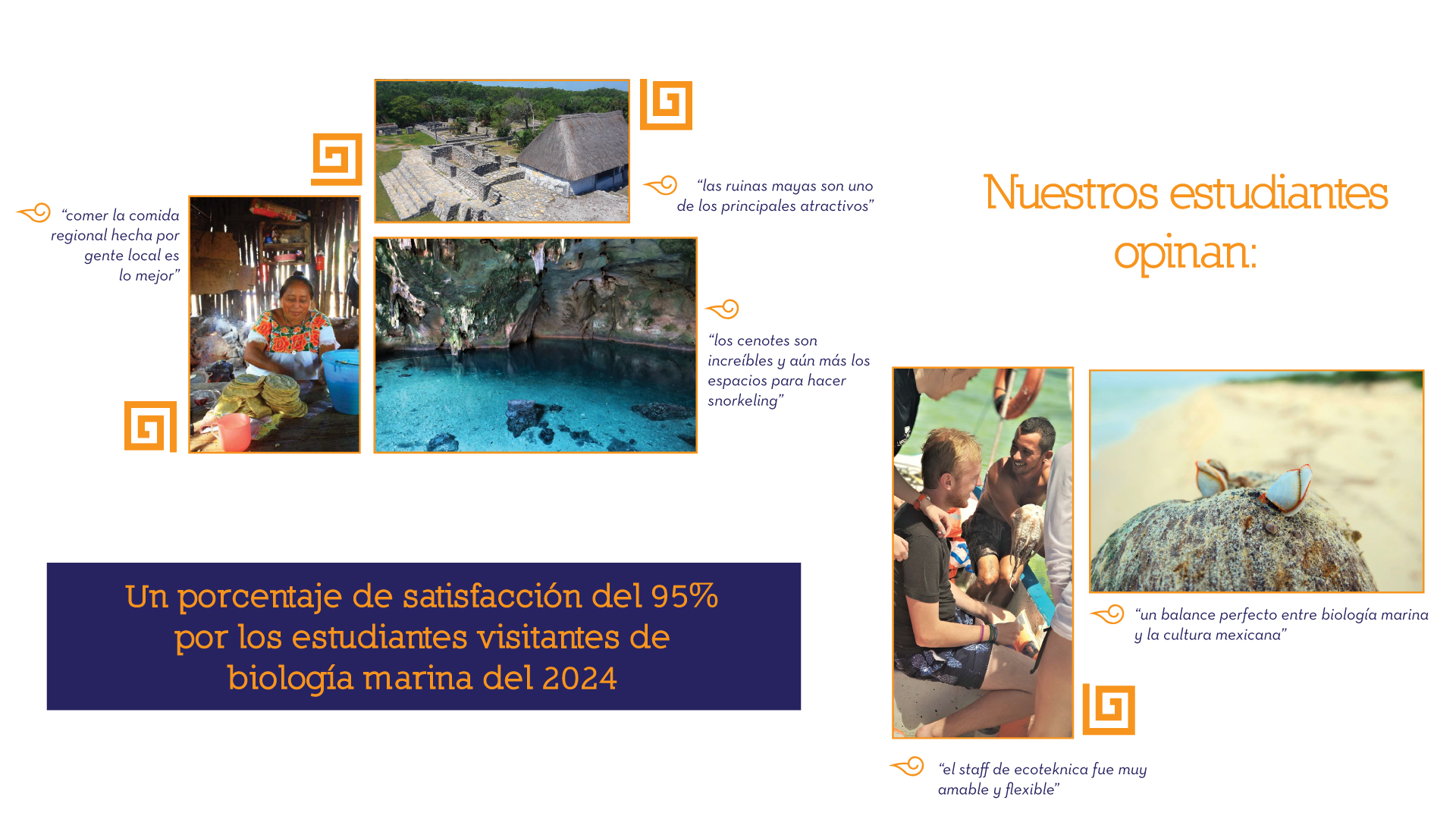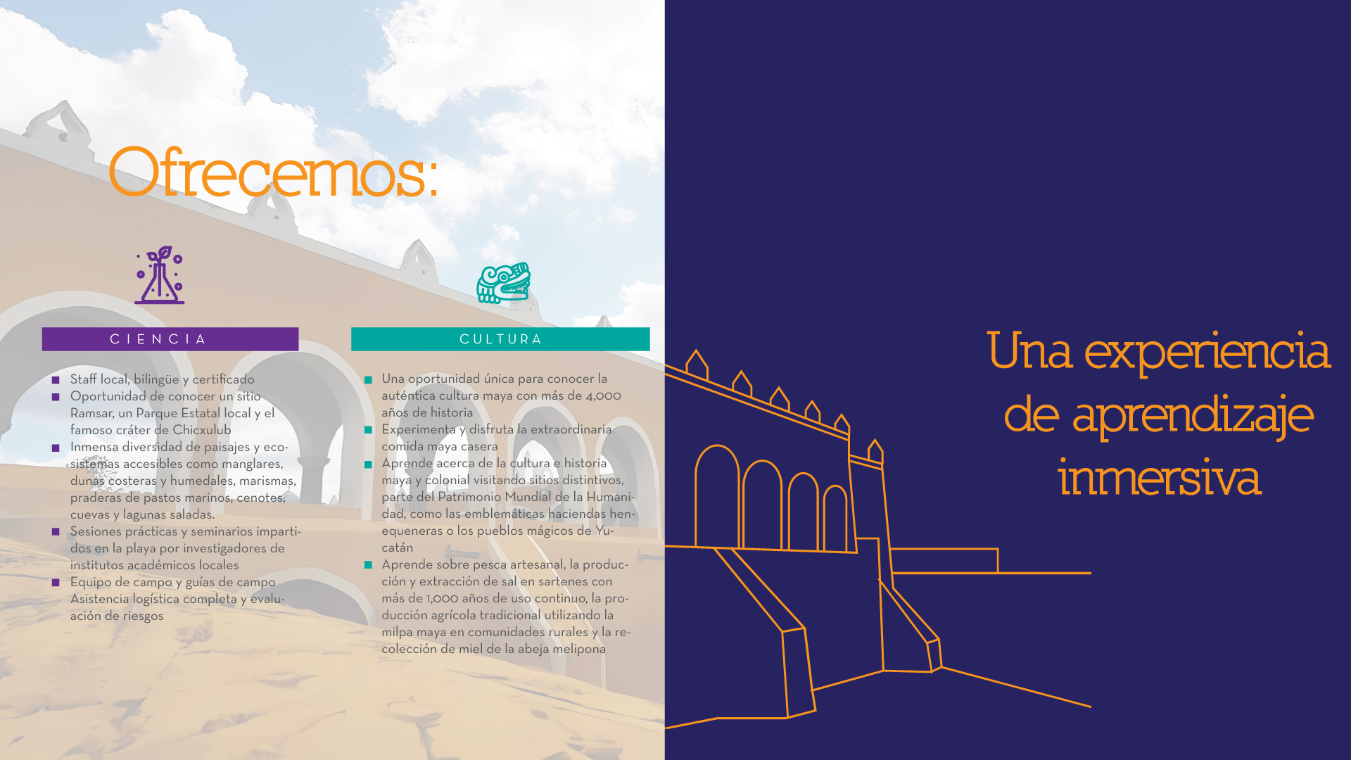 También hemos desarrollado cursos educativos de campo en Yucatán para estudiantes extranjeros de Biología Marina. Tenemos un profundo conocimiento de Yucatán, su flora y fauna, historia y cultura.